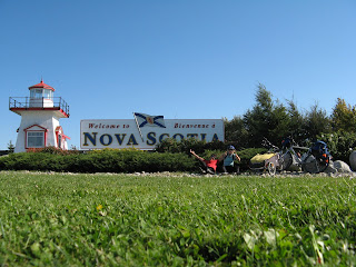 It was meant to be a short journey to the New Brunswick - Nova Scotia border, but seeing as how we had no full size highway map for New Brunswick we managed to over shoot our desired turn off by a good 20 km or so. This resulted in our riding a full 55km before finaly making it out of NB. Unfortunately, thanks to the combination of ailments that hindered us today it took us nearly four hours just to cover those 55km, and that was over fairly level ground! It was after 4:00 PM by the time we stepped into the Nova Scotia Info centre, and it was here that we held a lengthy discussion as to the design of our journey’s finale. The info centre lies close to 500 km away from the North Sydney ferry terminal.
